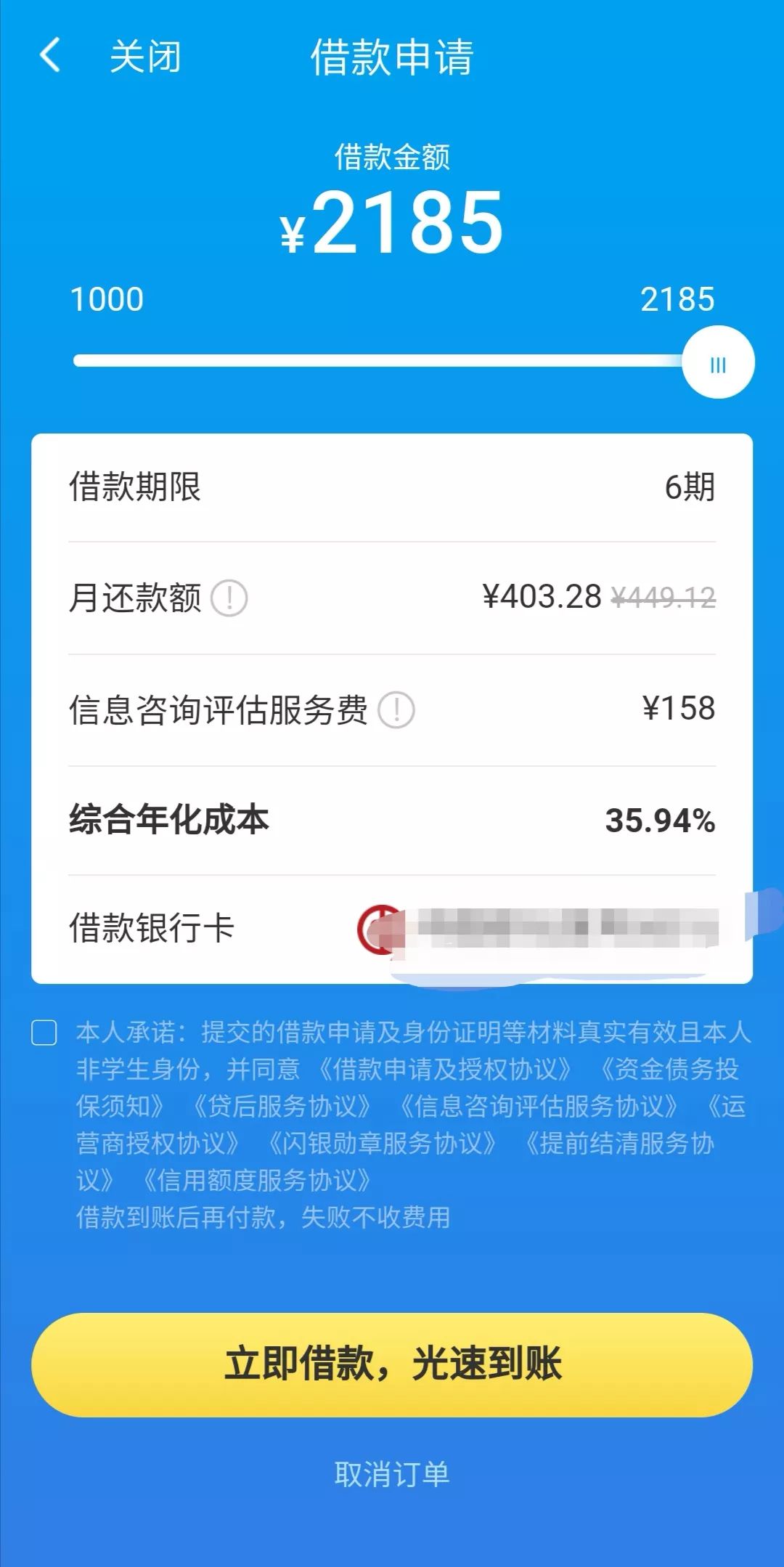 同時,閃銀APP上的新人專屬通道借款2185元,分6期還款,每期應還金額為403.28元,經計算,該產品年化利率約為22%。