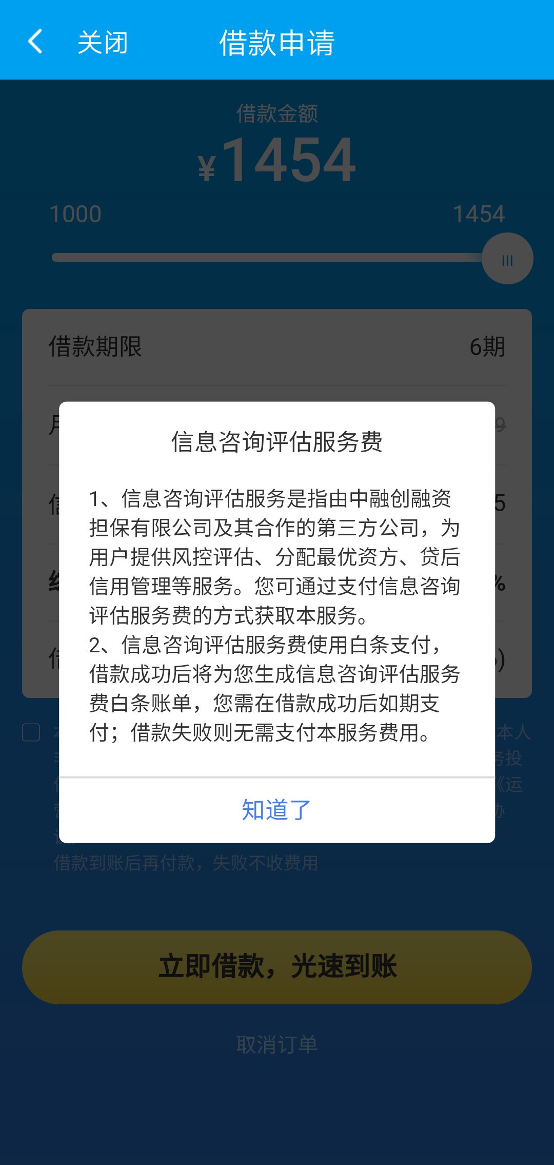 鐳射財經發現,信息咨詢評估服務費使用白條支付,借款成功后將為用戶生成信息咨詢評估服務費白條賬單,用戶需要在借款成功后如期支付;借款失敗則無需支付服務費用。