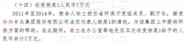 判決書顯示,謝立在辦公室等地先后五次收受楊振給予的人民幣共計7萬元,幫助加加食品通過環保核查,順利拿到了批文。