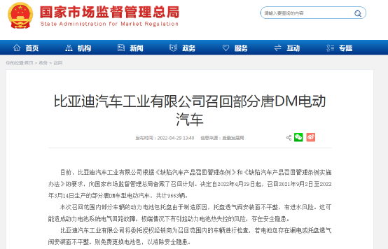 近日,比亞迪向國家市場監督管理總局備案了召回計劃,決定自2022年7月29日起,召回2021年4月5日至2022年4月18日生產的部分唐DM電動汽車,共計53928輛。原因是部分車輛托盤有進水風險,可能造成動力電池系統電氣回路故障,極端情況下有引發動力電池熱失控的風險,存在安全隱患。同時,這也是繼今年4月底召回計劃的擴大召回,兩次召回數量超6萬輛。