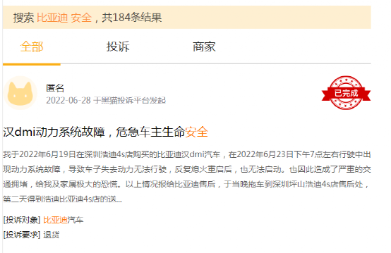在黑貓投訴等第三方平臺上,關于車輛存在安全隱患的投訴也有出現,其中不乏動力失速、雨天動力受限等情況,且大多集中在近兩年銷量上升。從輿論與官方召回計劃來看,比亞迪在銷量上升的同時沒能把控好質量,確實存在一定的安全隱患需要解決。