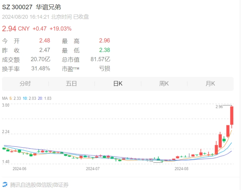 同樣,二級市場情緒被徹底撬動。因受預售熱潮影響,在游戲正式上線的前一周時間,A股掀起“西游狂潮”,多只概念股提前大漲。截至8月20日收盤,包括浙版傳媒、中信出版、新迅達等多只概念股漲停。尤其是華誼兄弟,自8月14日以來,華誼兄弟漲幅已超70%,其中8月19日漲停,8月20日盤中再度觸及漲停。