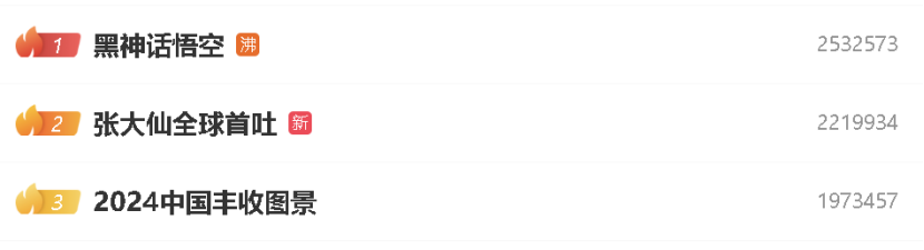 抖音、快手、B站等各大社交軟件,熱榜榜首均為黑神話悟空相關內容。