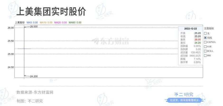 上美集團此次IPO募資凈額約為8.35億港元,開盤價為25.20港元/股,與發行價持平;盤中一度破發,最低觸及24.2港元/股。截至12月22日收盤,上美集團平收25.20港元/股,對應市值100億港元(折合人民幣約為89.56億元)。