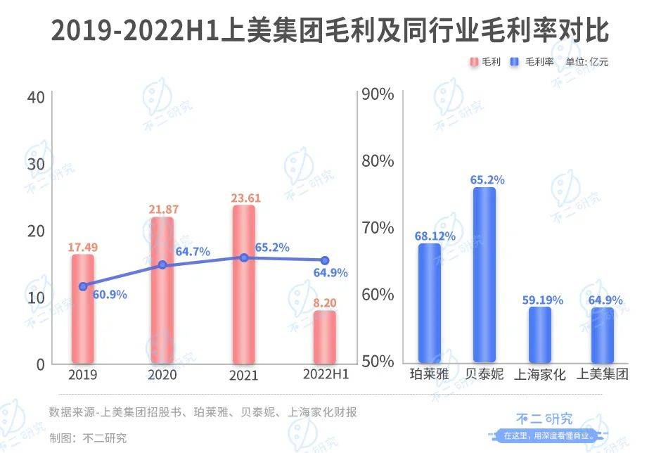 從毛利率看來也是如此。招股書顯示,2019-2022上半年,上美的毛利率分別為60.9%、64.7%、65.2%及64.9%。相比之下,2022上半年,上海家化毛利率為59.91%;珀萊雅毛利率為68.12%;貝泰妮毛利率為76.90%。上美在其中并不具備突出亮點。