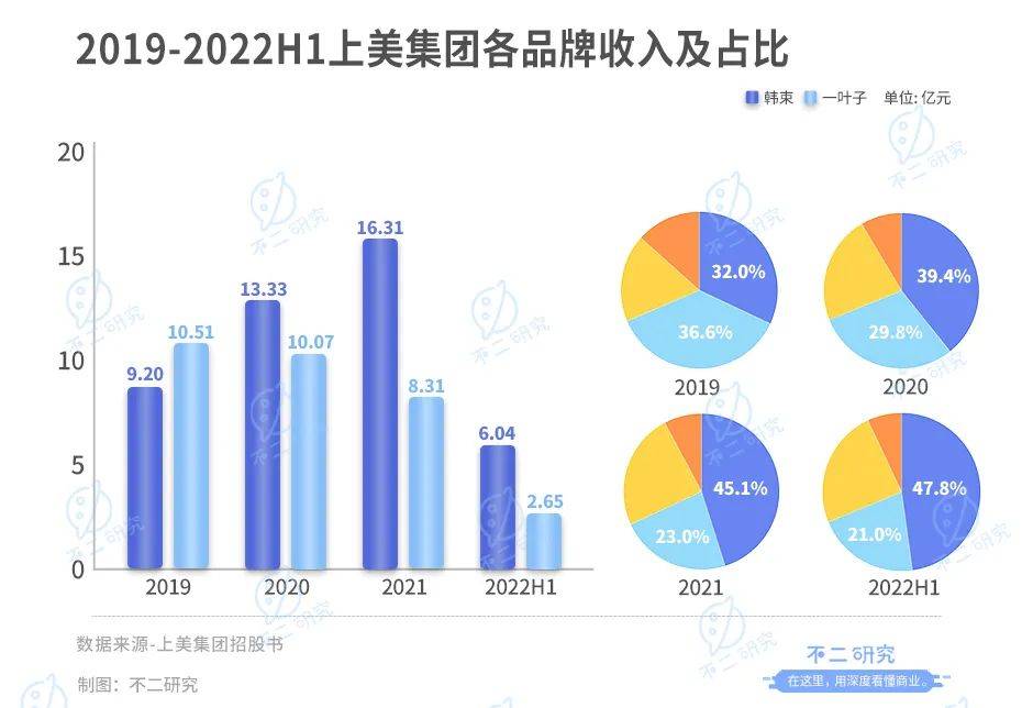 2019-2022上半年,韓束分別貢獻營收9.20億、13.33億、16.31億及6.04億,占比分別為32.0%、39.4%、45.1%及47.8%;一葉子收入10.51億、10.07億、8.31億及2.65億,營收占比從36.6%下降至21.0%;紅色小象營收占比則在20%左右。