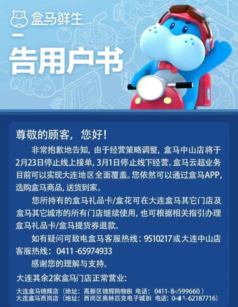 開頭網(wǎng)友傳的盒馬關(guān)門,確實是存在的, 2 月底大連盒馬門店就宣布停業(yè)。不過,盒馬一向開關(guān)門速度飛快,效益不好了就直接砍掉。
