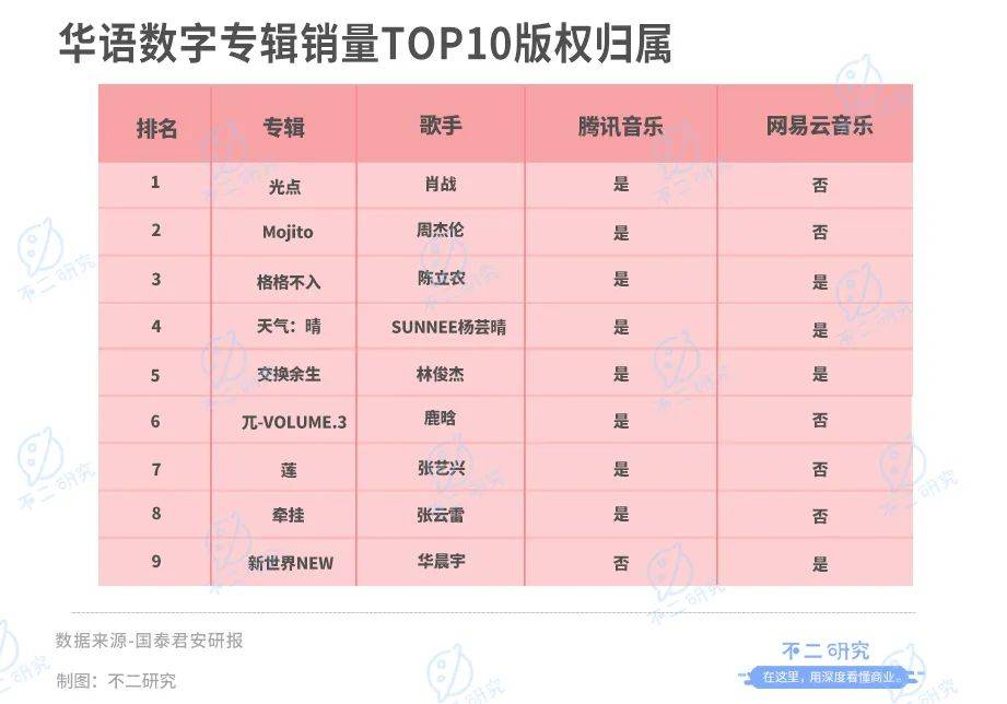根據國泰君安研報,在2020年華語數字專輯銷量TOP10中,授予騰訊獨家音樂版權的比例高于50%。