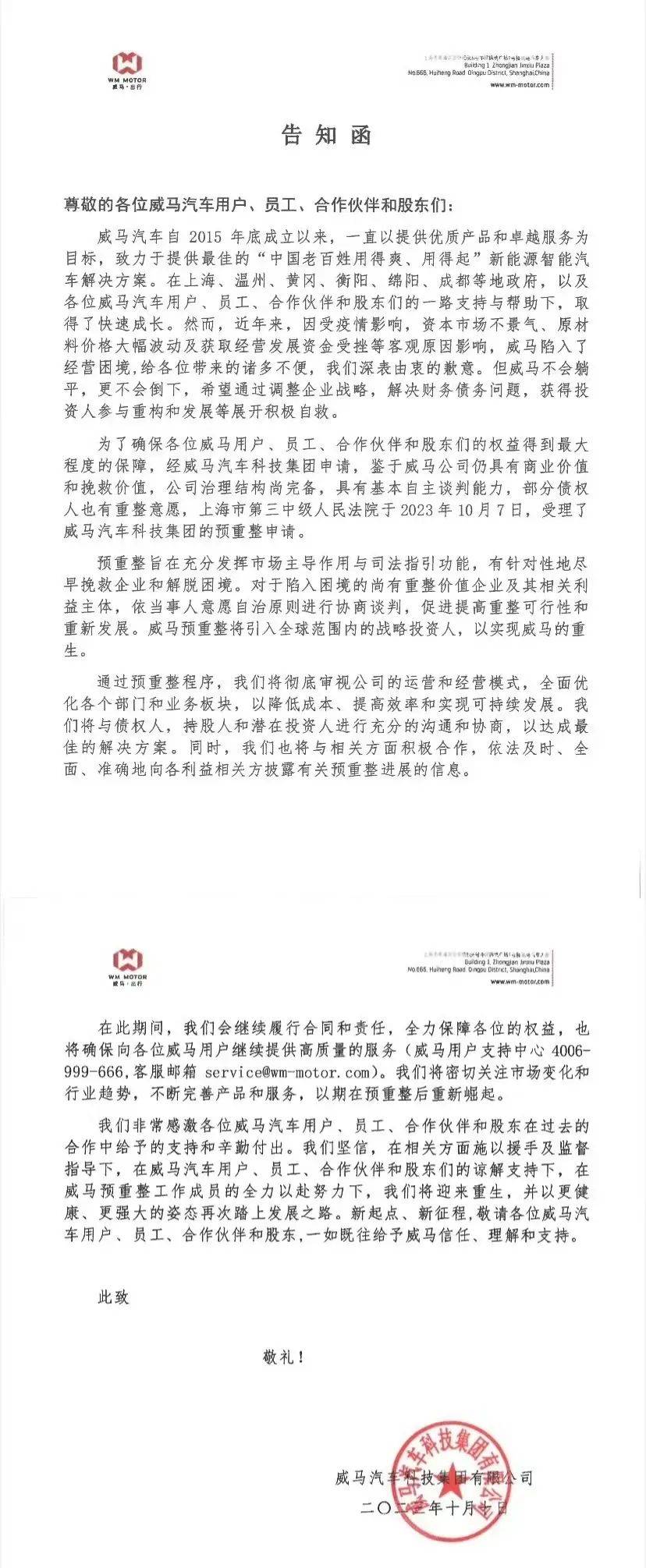 10月10日,全國企業破產重整案件信息網顯示,威馬汽車科技集團有限公司申請破產重整,申請人正是威馬汽車自身,辦理法院為上海市第三中級人民法院。