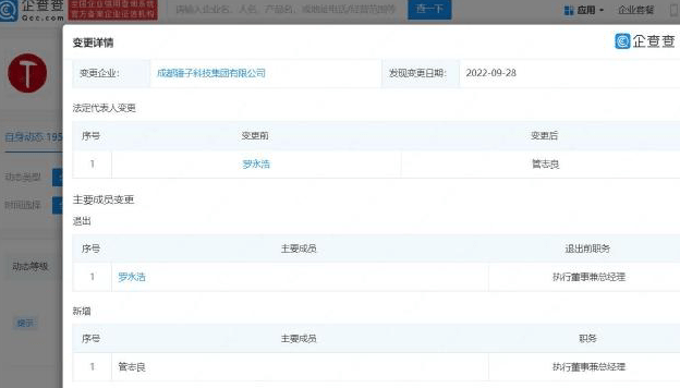 企查查App顯示,近日,成都錘子科技集團(tuán)有限公司發(fā)生工商變更,羅永浩卸任執(zhí)行董事兼總經(jīng)理、法定代表人職務(wù),由管志良接任。