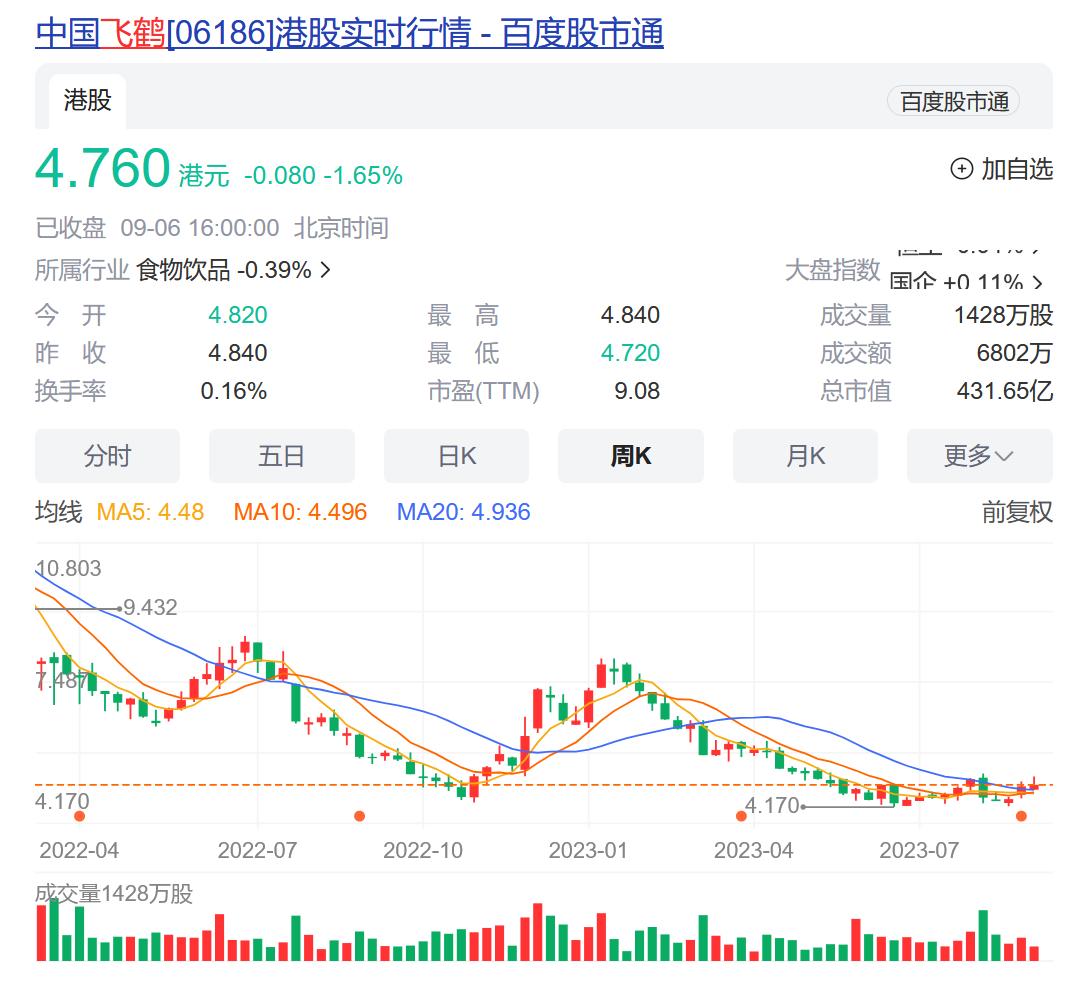 其中,飛鶴自今年1月份達(dá)到8.118港元/每股后,一路下滑至9月6日的4.76港元/每股,拋開除權(quán)影響,市值仍縮水超過40%。