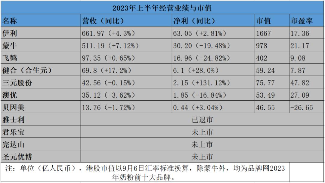 此外,從上表中的市值及營收數(shù)據(jù)可以看到,前十大奶粉品牌中,兩極分化嚴(yán)重,上半年市值超過百億的僅三家,營收超過百億的僅伊利、蒙牛。