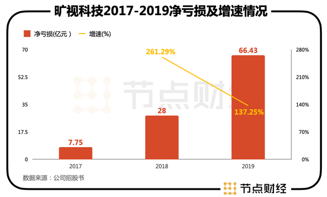 但是,稀缺的技術團隊、頗具創意的中臺構想和成長空間巨大的業務觸點,卻并沒有為曠視科技帶來令人驚喜的利潤表現。2017年至2019年,曠視科技凈虧損由 7.75億元擴大至66.43億,年均復合增速192.77%。根據招股說明書,虧損主要歸因于公司成立以來開展的多系列優先股融資,優先股公允價值持續上升,相關損失為5.75億元、22.68億元、53.77億元。
