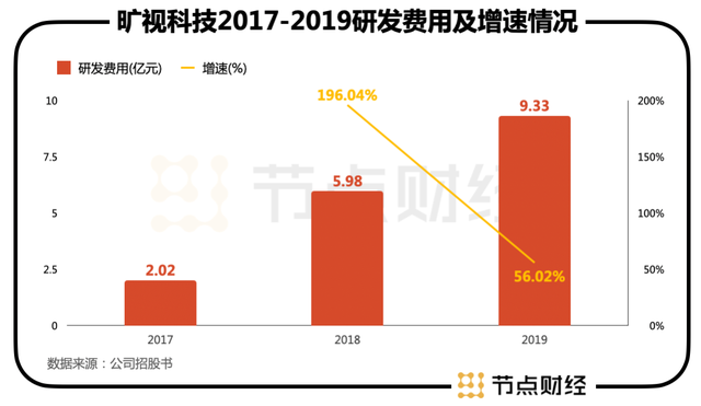 在營業收入與毛利率另一面的,是曠視科技不斷增加的費用支出。作為科技推動的公司,曠視科技的研發費用一直占比較高。2017年至2019年,曠視科技研發費用分別為2.02億元、5.98億元及9.33億元,占各期營業收入的比例分別為66.5%、70.02%及74.06%。