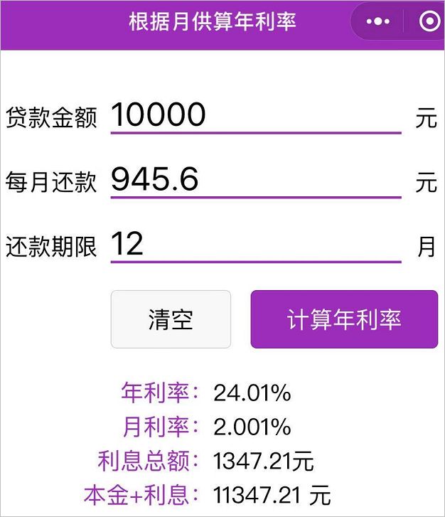 在這份特權(quán)的加持下,12 個月以后差評君要還 11347.2 元,共計 1347.2 元利息。感覺自己占便宜了,畢竟 0.04% 的日息看起來還挺低的,而且借這么久只需付 1347.2 元似乎也還好。按照 “ 利息/本金 ” 的公式,利率也只有 13.47% 而已。看起來是不是不算高?事實上,很多網(wǎng)貸機構(gòu)都喜歡用“ 我們利率很低 ” 來說服你借款,而你用 “ 利息/本金 ” 一算也的確如此,其實你被騙了。為什么?我們分了 12 期,每個月都要還本金和利息,當(dāng)我們還到第 11 個月時其實就只剩不到 1 千的貸款了。但這個時候網(wǎng)貸機構(gòu)還是在按 1 萬借款收取的利息。實際上,剛才那筆交易實際利率接近 24.01%。遠超 13.47% 。通過小程序“計算等額本息年利率月供年利率”計算