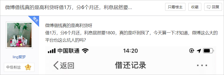 所以,這微博借錢這根本就不是什么劃算的 “ 買賣 ”。有低息特權(quán)都這樣了,那沒有低息特權(quán)的呢?~在網(wǎng)貸投訴吧有這樣一個帖子。