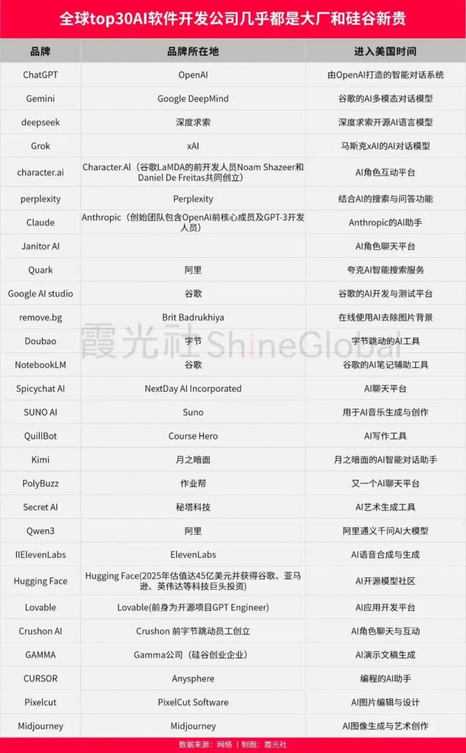 統(tǒng)計2025年8月a16z發(fā)布的第五版互聯(lián)網(wǎng)AI產(chǎn)品TOP50榜單,排名前30的軟件也幾乎被硅谷科技巨頭、硅谷創(chuàng)業(yè)產(chǎn)業(yè)和國內(nèi)互聯(lián)網(wǎng)大廠包攬。