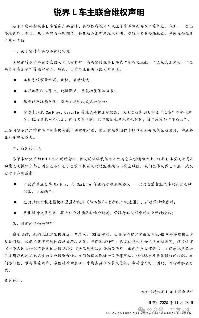 11月28日,長安福特銳界L車主發布集體維權聲明,就車機問題導致行車過程的安全隱患,向長安福特品牌明確提出核心訴求。主要包括開放并原生支持 CarPlay 與 CarLife 等主流手機互聯協議、全面升級車載地圖軟件至最新版本、優化語音交互系統等。