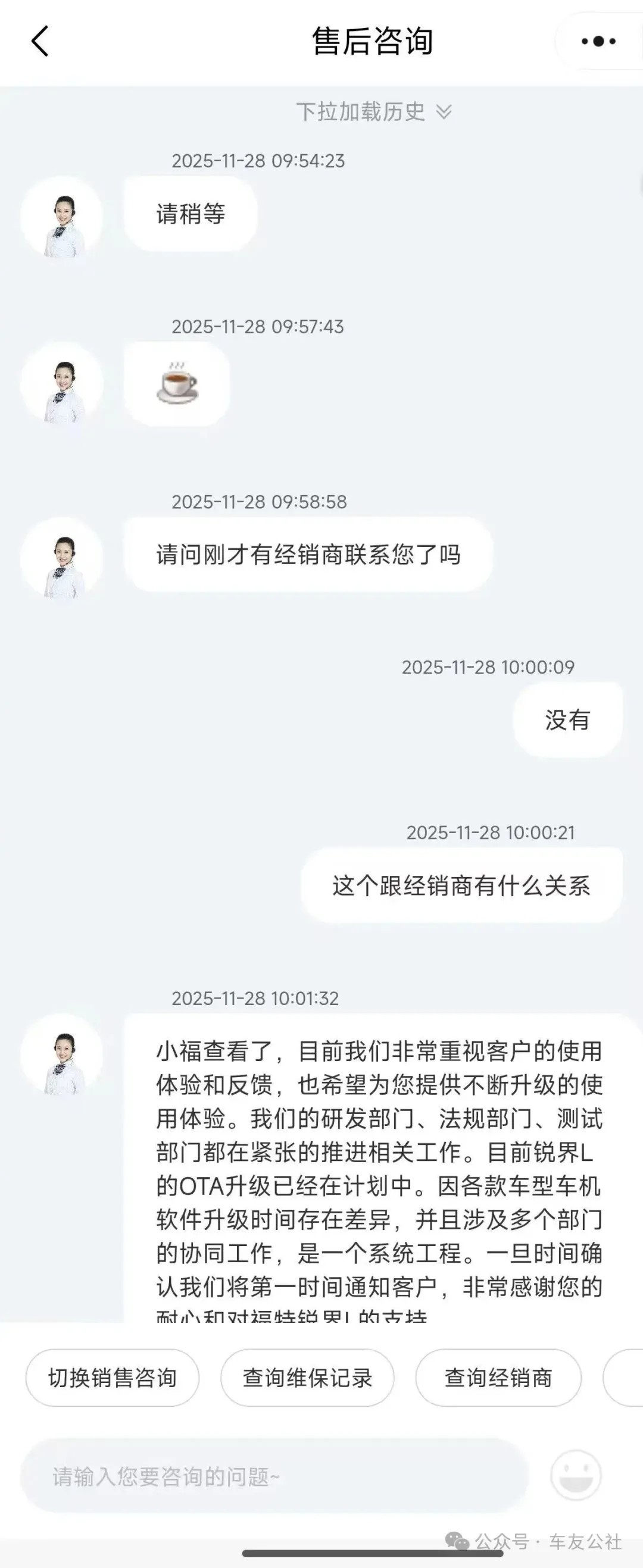 浙江省金華市的車主云飛揚(化名)則在一次次溝通中耗盡了耐心。他的2023款銳界L兩驅豪華款購于2024年3月,購車時銷售人員承諾的“OTA遠程升級拓展應用”,成了他長期的期待。2025年11月28日,他再次聯系廠家客服,得到的回應是:“研發、法規、測試部門都在推進相關工作,銳界L的OTA升級已在計劃中,因涉及多部門協同,時間確定后會第一時間通知。”面對這番官方說辭,云飛揚忍不住發問:“車主們盼了這么久,到底什么時候是個頭?”