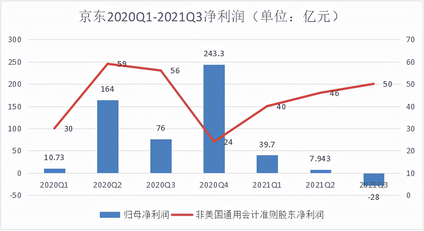 但其歸母凈虧損為28億元,低于去年同期凈利潤的76億元(具體原因下文解釋)。另外,其三季度經營利潤為26億元人民幣,同樣低于去年同期的44億元。對此京東給出的解釋為利潤下降主要源于京東在實體經濟方面的持續投入。