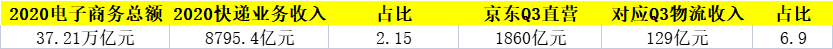 優異配送服務與之而來的,則是高成本問題。我們看兩則數據,2020年中國電子商務總規模在37.21萬億元,而2020年中國快遞業務收入在8795.4億元,快遞費用占比電商總額的2.15%。而根據京東Q3財報計算,該季度來自商品的收入為1860億元(直營業務),對應的物流收入是257.49億元的一半即129億元(其中外部收入占比一半),該比例則是6.9%(和京東透露的履約成本數值類似),是整體水平的三倍之多。