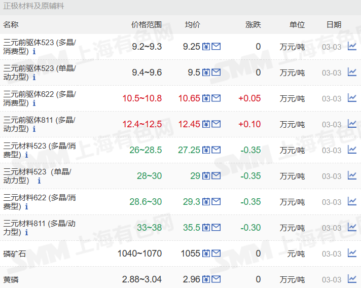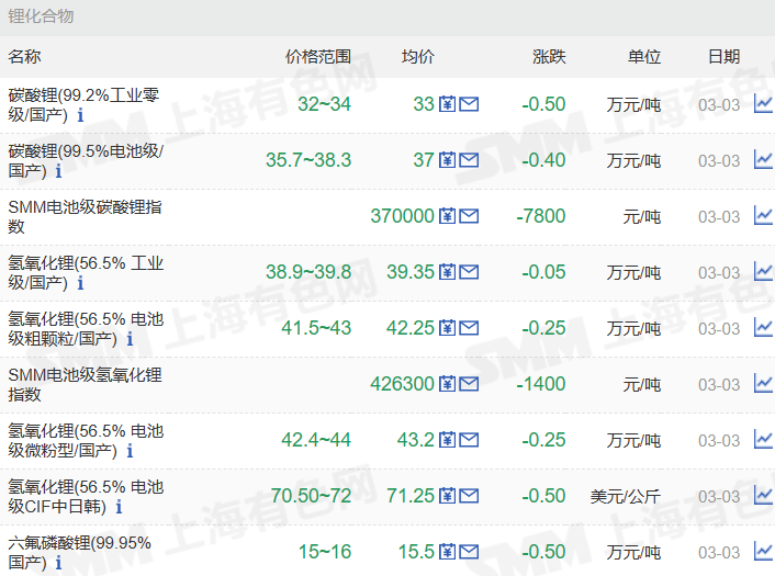 根據上海有色網數據,截至2月24日,電池級碳酸鋰均價37萬元/噸,工業零級碳酸鋰均價33萬元/噸;電池級氫氧化鋰(56.5%國產粗顆粒)均價42.25萬元/噸,工業級氫氧化鋰均價39.35萬元/噸。三元材料方面,523多晶、523單晶、622多晶、811多晶均價分別報每噸27.25,29,29.3,35.5萬元。