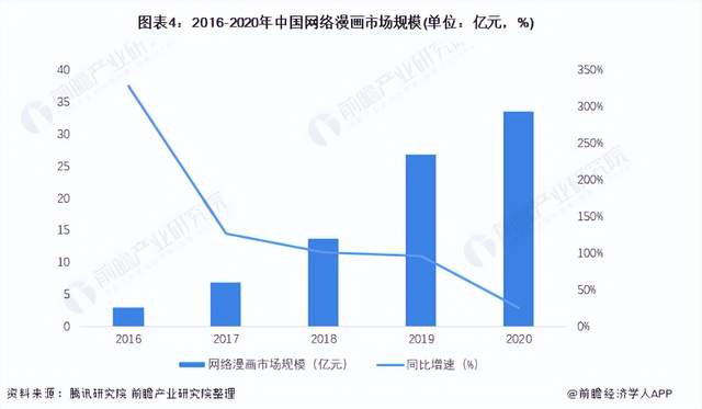 國內網絡漫畫市場規模同期雖屬于增長狀態,體量擴大了近十倍,但增速同樣也在下滑。2020年,中國網絡漫畫市場規模達到33.5億元,同比增速僅25%。