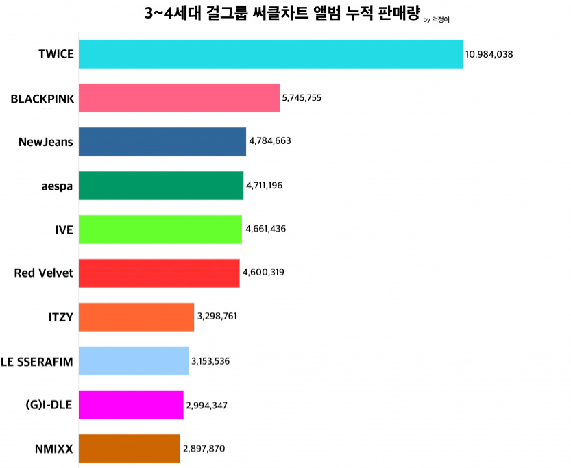 但從全年專輯銷量情況看,BLACKPINK的優(yōu)勢地位正在被逐漸蠶食。Circle Chart數(shù)據(jù)顯示,3~4代女團(tuán)Circle chart專輯累計(jì)銷量排名,第一位是死守韓國本土的Twice,專輯銷量1098萬張,第二位BLACKPINK 574萬張,NEW JEANS 478萬張