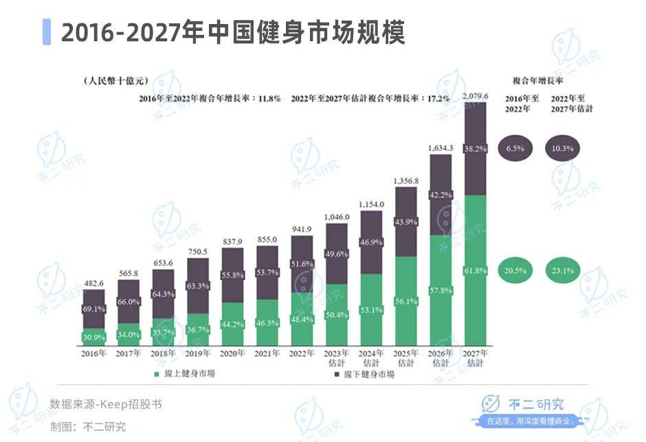 Keep在招股書(shū)中援引灼識(shí)咨詢報(bào)告稱,按經(jīng)銷渠道劃分,中國(guó)健身市場(chǎng)2016年達(dá)4.83千億元,2022年增至9.42千億元,復(fù)合年增長(zhǎng)率11.8%,預(yù)計(jì)2027年將以17.2%的年復(fù)合增長(zhǎng)率增至20.77千億元。其中,2022年中國(guó)線上健身市場(chǎng)占中國(guó)整體健身市場(chǎng)的48.4%,預(yù)計(jì)2027年將占61.8%。
