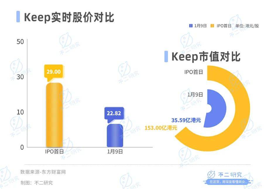 截止1月9日港股收盤,Keep報(bào)收6.77港元/股,對(duì)應(yīng)市值35.59億港元(約折合人民幣32.61億元);對(duì)比IPO首日市值153億港元,上市后的五個(gè)月內(nèi),其市值已經(jīng)蒸發(fā)116.68億港元(約折合人民幣106億元)。
