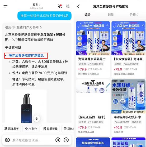 當小編發送“推薦幾款適合北京秋冬季的護膚品”這個話題時,豆包首先指出“北京秋冬季護膚關鍵在于深度保濕+屏障修復”,并據此推薦了6款產品,有乳液、面霜和身體乳,涵蓋平價實用型以及高端專業型,價格從9.9元的試用裝到640元的正裝不等,還給出了產品圖片做參考。