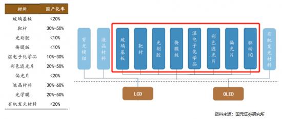 LCD和OLED共同需要的顯示材料主要有玻璃基板、驅動IC、偏光片、光刻膠、彩色濾光片等8種。