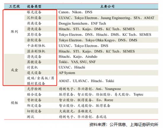 OLED面板生產工藝主要分為前段陣列、中段成盒、后段模組三部分。其中,前中段所需設備技術壁壘較高,分別占產線中設備總投資額約75%和20%,供應商以美、日、韓廠商主導。后端設備技術壁壘相對較低,我國廠商參與度較高。