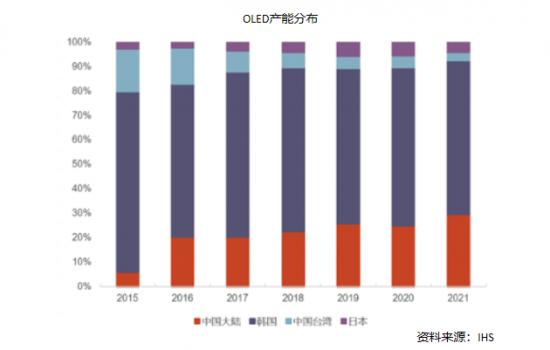與LCD類似,全球OLED產能主要集中在韓國、中國和日本三國。韓國企業在OLED領域布局較早,尤其是三星,2000年就成立了項目組,自2005年建立4.5代OLED專用生產線以來,長期占據著全球OLED面板產能的首位。