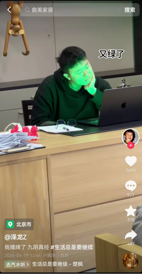 趙澤龍不僅非常具有網感,還能巧妙地借梗造勢。比如,有網友調侃曲美家居股票陰跌,他立刻以此為靈感發布了一條以“九陰真經”為標題視頻,趙澤龍被電腦屏幕照映得臉泛綠光,引發了網友們的熱烈討論。