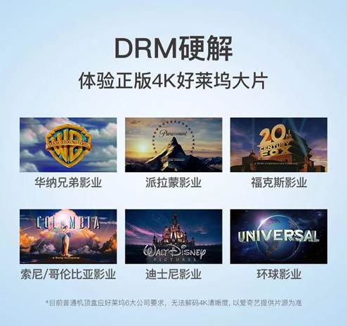 喜歡好萊塢電影的朋友,對DRM(數字權限管理技術)絕對是剛需,因為不支持DRM便無法觀看,或僅能看720P普清視頻。愛奇藝電視果5S超前行業,率先支持DRM硬件級解碼,是目前唯一實現DRM硬解的投屏硬件,派拉蒙、迪士尼、福克斯、索尼/哥倫比亞、環球影業及華納兄弟六大公司的大片均支持,暢享好萊塢正版1080P及4K超高清大片。