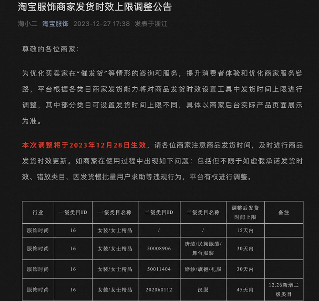 不只是"僅退款",為了提升核心品類——服飾的用戶體驗(yàn),淘寶還對(duì)大家詬病已久的預(yù)售動(dòng)了刀。淘寶服飾發(fā)布公告,對(duì)商家發(fā)貨時(shí)效上限作出調(diào)整,日常女裝等大部分服飾箱包鞋類的發(fā)貨時(shí)間上限為15天,唐裝/民族服裝/舞臺(tái)裝、婚紗/旗袍/禮服等類目不得超過30天,漢服類不得超過45天。若因超時(shí)發(fā)貨被買家發(fā)起投訴,商家可能需要賠付。