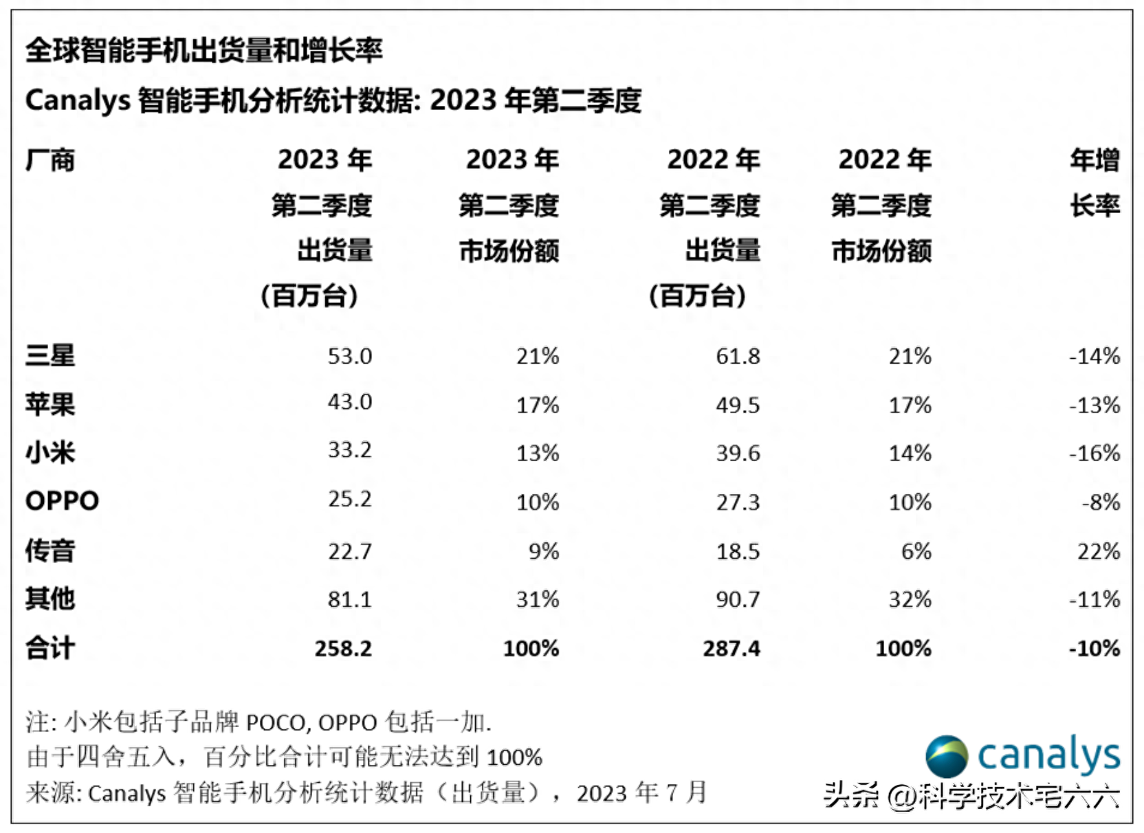 Canalys最新的數據顯示,今年第二季度全球前五大手機品牌分別是三星、蘋果、小米、OPPO、傳音,傳音居然超過了vivo