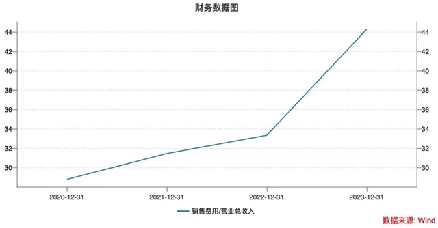 深入分析財報數據,問題的根源一目了然:藍月亮的銷售費用正如無底洞般吞噬著公司的利潤。從2020年到2023年,藍月亮的銷售費用從20.17億港元一路飆升至32.44億港元,銷售費用率從28.8%飆升至44.3%。這意味著,藍月亮每賣出一瓶洗衣液,就在燒掉更多的錢來維持市場份額,利潤卻一再縮水。