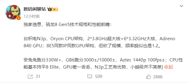 其他方面,根據(jù)此前曝光的消息,全新的vivo S50 Pro mini將搭載高通驍龍8 Gen5平臺(tái),采用臺(tái)積電3nm工藝制程,CPU由2*3.8GHz超大核+6*3.32GHz大核組成,集成Adreno 840 GPU,安兔兔跑分突破330萬分,單核成績(jī)?cè)?000分左右,多核成績(jī)?cè)?0000分左右。該博主表示,驍龍8 Gen5的CPU性能跟驍龍8 Elite基本持平,GPU差一丟丟。此外,該機(jī)將配備潛望長(zhǎng)焦,這是行業(yè)內(nèi)第一款驍龍8 Gen5小屏旗艦,并且還將繼承S30 Pro mini的全場(chǎng)景影棚級(jí)人像功能,隨手拍出人像大片。
