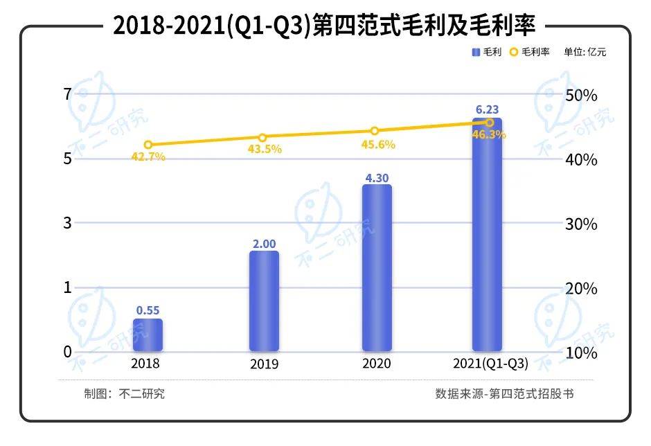 2018年~2021前三季度年,其營收分別為1.28億元、4.6億元、9.42億元、13.45億元;同期的毛利分別為0.55億元、2.00億元、4.3億元、6.23億元。