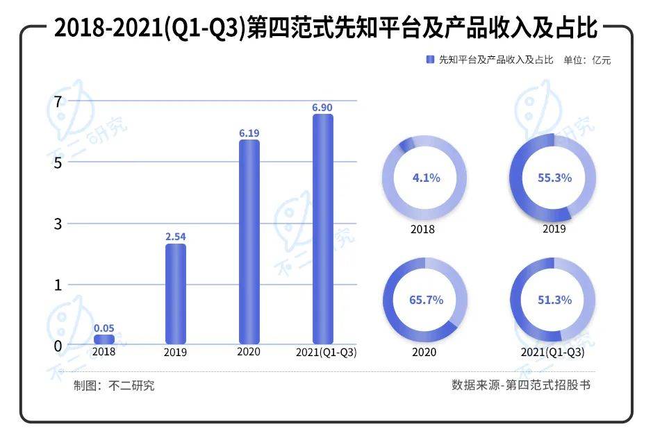 2018~2020年以及2021年前三季度,其先知平臺及產品收入分別為分別為523萬元、2.54億元、6.19億元和6.90億元,占總收入的4.1%、55.3%、65.7%和51.3%。