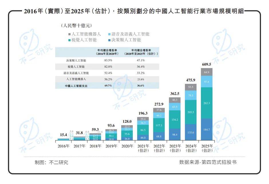 根據灼識咨詢報告,2020年,中國人工智能支出達到1280億元,預計于2025年將增長至6095億元,年均復合增長率為36.6%。