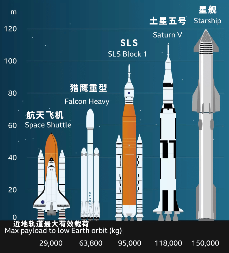 首先,這個 120 米高、可以裝載 100 噸貨物、100 名人類乘客的星艦,生前擊敗了土星五號, 是人類歷史上最大、推進力最強的火箭。