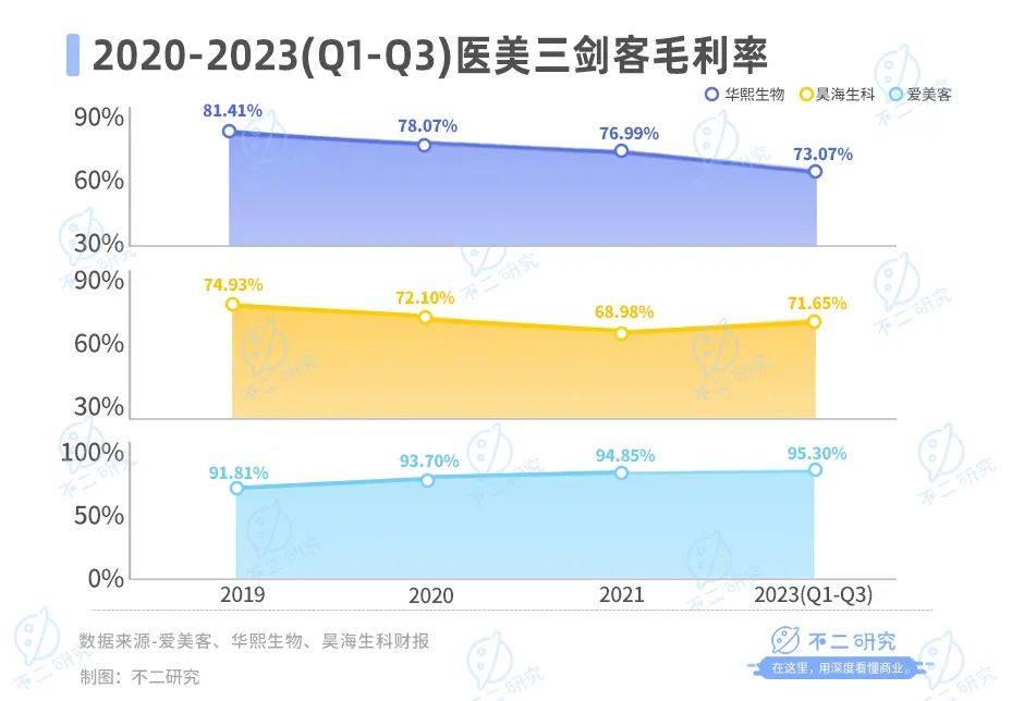 此外,據(jù)醫(yī)美三劍客財(cái)報(bào)顯示,三大廠商的毛利率水平相差較大。2020-2023年前三季度華熙生物毛利率分別為81.41%、78.07%、76.99%、73.07%;同期,昊海生科的毛利率為74.93%、72.10%、68.98%、71.65%;而愛(ài)美客的毛利率為91.81%、93.70%、94.85%、95.30%。