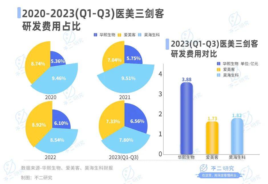 至此,美得妥旗下三款肉毒毒素產(chǎn)品許可全部被吊銷。這對(duì)于華熙生物而言,無(wú)疑是一記打擊,其借力拓展瘦臉針業(yè)務(wù)的計(jì)劃也暫時(shí)落空。 今年9月5日,華熙生物發(fā)公告稱韓國(guó)公司Medytox已同意終止合資協(xié)議和獨(dú)家代理協(xié)議,但索賠的仲裁目前暫未開(kāi)庭審理。 愛(ài)美客在2018年開(kāi)始布局肉毒素市場(chǎng),2021年收購(gòu)韓國(guó)肉毒素品牌Hunons 25.42%股權(quán)。據(jù)愛(ài)美客在2023年3月28日的投資者調(diào)研紀(jì)要稱“其注射用A型肉毒毒素已經(jīng)完成III期臨床試驗(yàn),目前正在整理注冊(cè)申報(bào)階段”。 與此同時(shí),昊海生科通過(guò)股權(quán)投資進(jìn)入肉毒素和小分子藥物領(lǐng)域,目前在醫(yī)美領(lǐng)域形成“玻尿酸+肉毒素+光電設(shè)備”的產(chǎn)品組合布局。 「不二研究」認(rèn)為,除了布局肉毒素外,醫(yī)美三劍客新品研發(fā)儲(chǔ)備亦是引領(lǐng)未來(lái)的重要因素。只有不斷創(chuàng)新和推出新的產(chǎn)品線,才能在激烈的市場(chǎng)競(jìng)爭(zhēng)中立于不敗之地。 據(jù)醫(yī)美三劍客財(cái)報(bào)顯示,華熙生物2020-2023年前三季度研發(fā)費(fèi)用率分別為5.36%、5.75%、6.10%、6.56%;同期,昊海生科的研發(fā)費(fèi)用率為9.46%、9.51%、8.54%、7.80%;而愛(ài)美客同期研發(fā)費(fèi)用率為8.74%、7.04%、8.92%、7.33%。 華熙生物研發(fā)費(fèi)用率為醫(yī)美三劍客中最低,但這主要由于華熙生物營(yíng)收體量大。從絕對(duì)數(shù)值看,華熙生物研發(fā)費(fèi)用投入最大,2023年前三季度為3.88億元,同期昊海生科和愛(ài)美客分別為1.82億元和1.73億元。