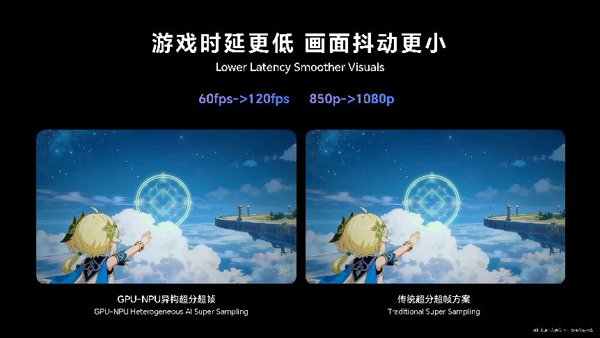依托這一超融核架構,榮耀在驍龍平臺上獨家首發基于GPU-NPU異構的A超分超幀技術。該技術先通過對目標游戲的海量場景數據進行深度學習,讓AI模型掌握游戲畫面中的“圖像特征”“運動特征”“光流特征”等關鍵信息;再借助高通芯片強大的AI算力,對低分辨率、低幀率的游戲畫面進行實時渲染推理與AI融合,從而輸出高分辨率、高幀率的畫面。