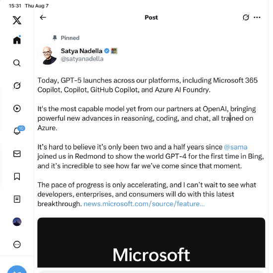 GPT-5發(fā)布之后,OpenAI的戰(zhàn)略合作伙伴也紛紛跟進(jìn)。微軟CEO納德拉隨后在社交媒體上表示,“很難相信現(xiàn)在距離2023年2月我與奧特曼一道在微軟總部首次展示GPT-4,僅僅過去了兩年半,更令人難以置信的是我們?nèi)〉昧嗽鯓拥倪M(jìn)步。”
