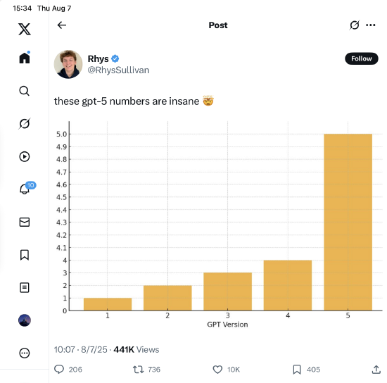 但或許奧特曼感到尷尬的是,發(fā)布會(huì)上令人印象最深的,不是GPT-5強(qiáng)大的編程與推理能力,而是一張變形的PPT圖表。很多AI技術(shù)愛好者看到發(fā)布會(huì)這一幕時(shí),都驚呆了,“啊,就這?”