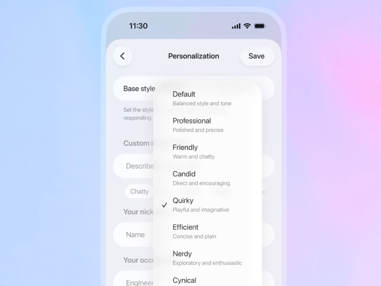 新增 “專業(yè)(Professional,語氣嚴(yán)謹(jǐn)精準(zhǔn))”“坦誠(Candid,語氣直接且具鼓勵性)”“俏皮(Quirky,語氣活潑有想象力)” 三種風(fēng)格。